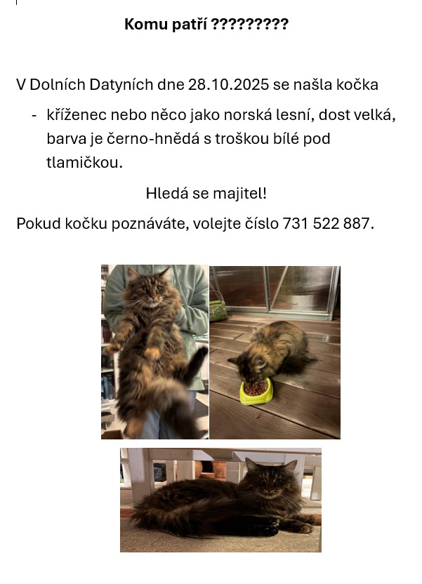 Dobrý večer,Dnes jsme u knihovny našli kočku, sama šla za námi až domu. Evidentně je zvyklá na lidi. Prosím o zveřejnění přílohy. Děkuji a jsem s pozdravem,Zdeněk Halámka Tel: 731552887