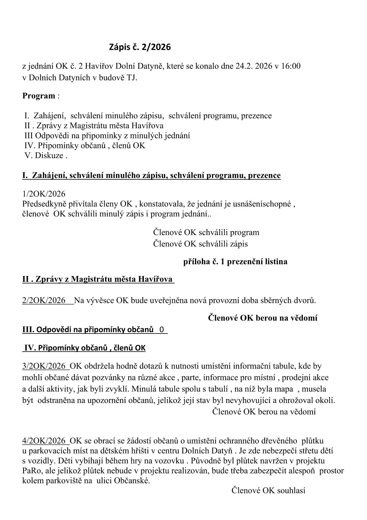 24.2.2026 proběhlo jednání OBČANSKÉ KOMISE č.2 Havířov Dolní Datyně - Zveřejňuji informace z jednání OK DD. Bližší info Vám ráda sdělí předsedkyně: Miroslava OLŠÁKOVÁ